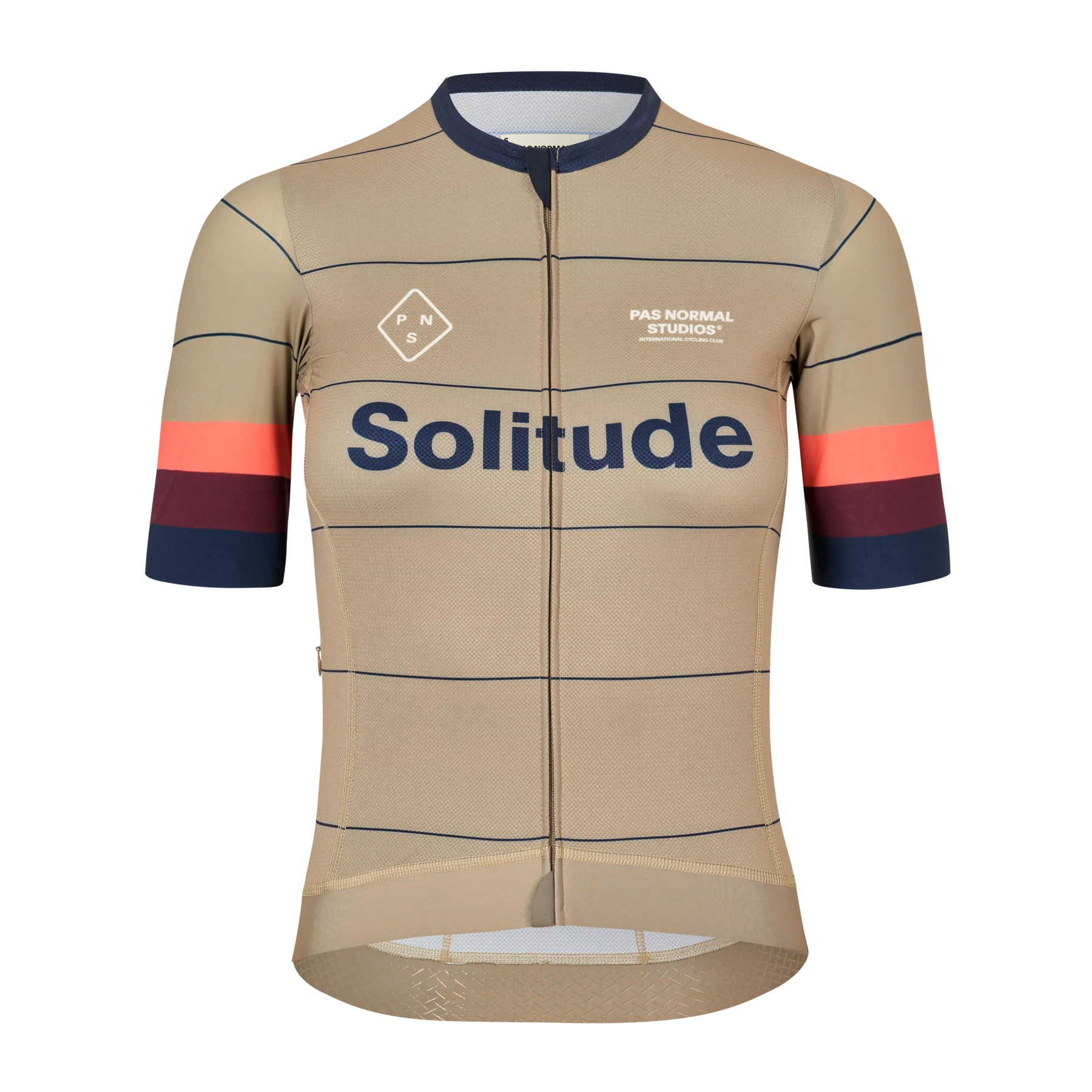 The Jersey offers easy access to pockets and a lowered armhole for comfort when positioned on the bike. The resilient sleeves effortlessly stretch into any shape to maintain an aerodynamic advantage. Free from any elastic grippers, we have eliminated all high-friction areas on these raw-edge sleeves. The Solitude jersey is constructed from proprietary fabrics developed for Pas Normal Studios. The microstructure of the main jersey fabric provides breathability and reduces clinging to your skin. Effectively eliminating the need for a base layer.